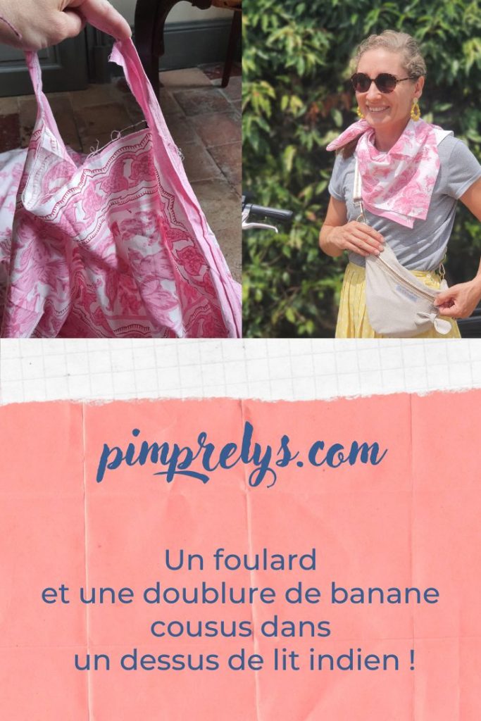 Résultat : une banane unique… et discrètement matchy-matchy avec les petits foulards que j’ai cousus dans la foulée avec les chutes de tissu pour mes filles et moi. (J’ai très simplement découpé les quatre angles du dessus de lit !). Parce que oui, il m’en restait pas mal, alors j’ai décidé de prolonger le plaisir avec des accessoires coordonnés. Contrairement à mon Tuto de foulard triangulaire, je n’ai pas doublé cette fois-ci puisqu’il s’agit de foulards printaniers !