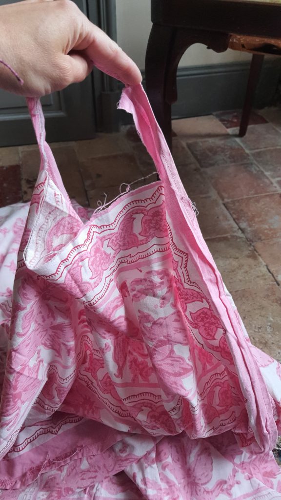 À l’intérieur, j’ai glissé une doublure en tissu indien rose et blanc tout droit sorti de mon enfance. Ce tissu, je le connais par cœur, et j’avais envie de lui redonner une place dans mon quotidien. Il s’agit de mon dessus de lit de jeune fille. Il s’était abîmé mais ma maman me l’avait gardé précieusement, persuadée que j’en ferai quelque chose. Elle me connait bien !